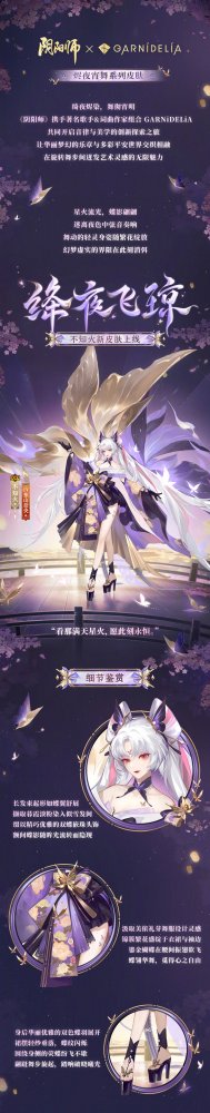 裁烬夜韶景织作新装,染夕夜绛色着身华服。夜色中身姿隐现,静待乐起瞬间——《阴阳师》× GARNiDELiA全新联动,「烬夜宵舞」系列皮肤即将上线!