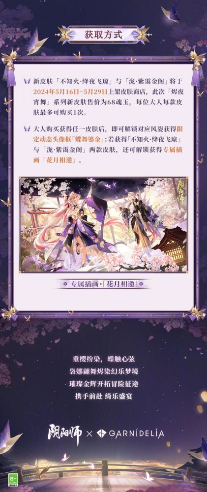 《阴阳师》再度携手著名歌手&词曲作家组合——GARNiDELiA(美依礼芽、特酷)共同开启音律与美学的创新探索之旅,联合打造「烬夜宵舞」系列新皮肤——「不知火·绛夜飞琼」与「泷·紫霭金阁」,更有联动活动「极乐舞宴」即将开启,以跃动音律开启视听盛宴~
