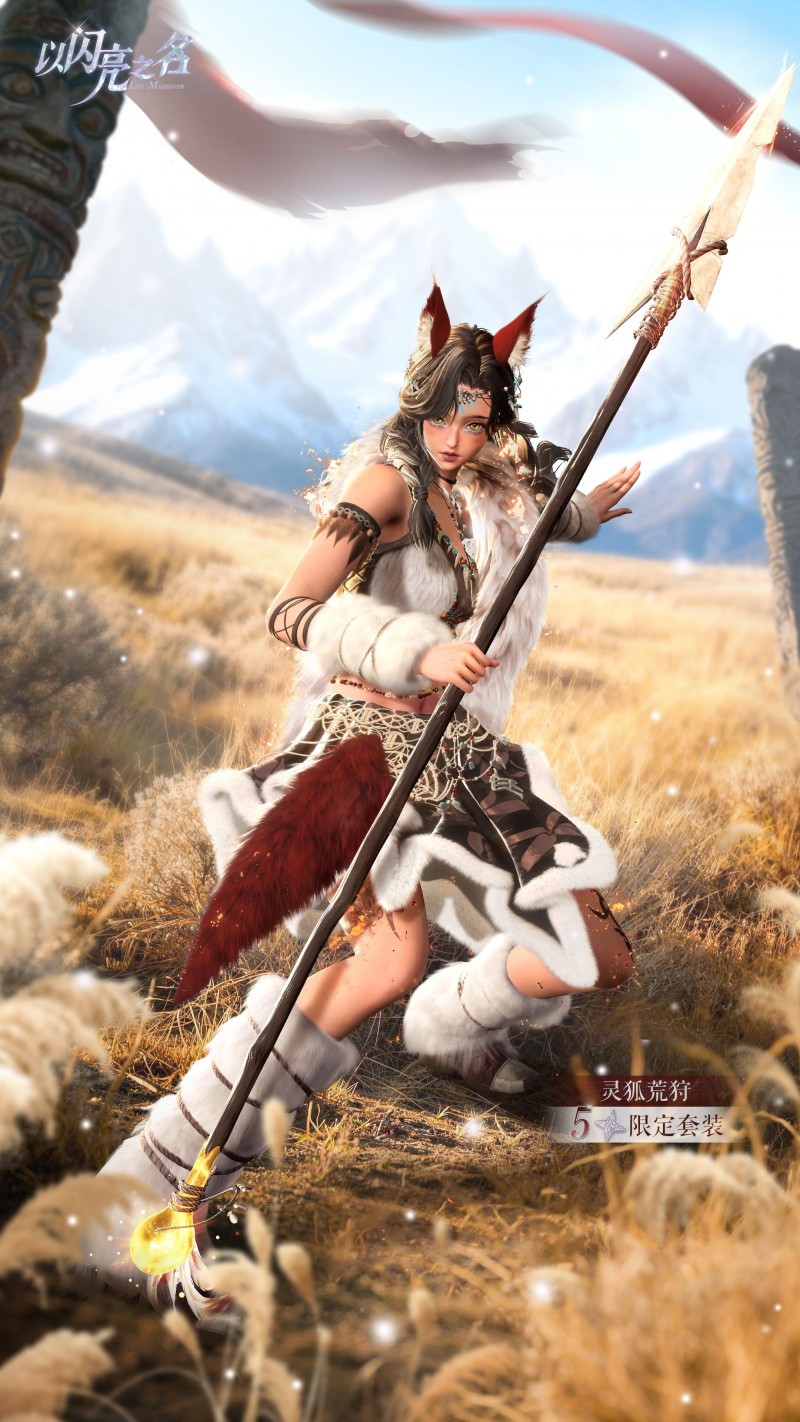 与湮世瞳华的华丽凌厉形成鲜明反差,五星套装灵狐荒狩则将目光投向远古荒原,自带粗粝而炽热的原始生命力,初见之下便让人感受到扑面而来的荒原气息。白绒毛领如兽鬃般舒展,从肩部向外延展,勾勒出猎者的挺拔身姿,蓬松的绒毛质感细腻,仿佛刚从寒原风雪中归来,带着自然的温度。骨饰与狼牙串联成荣耀的纹章,缠绕在脖颈与腰间,不规则的骨节装饰与粗粝的雕刻纹样,记录着每一次狩猎的胜利,是猎者勇气与实力的象征。