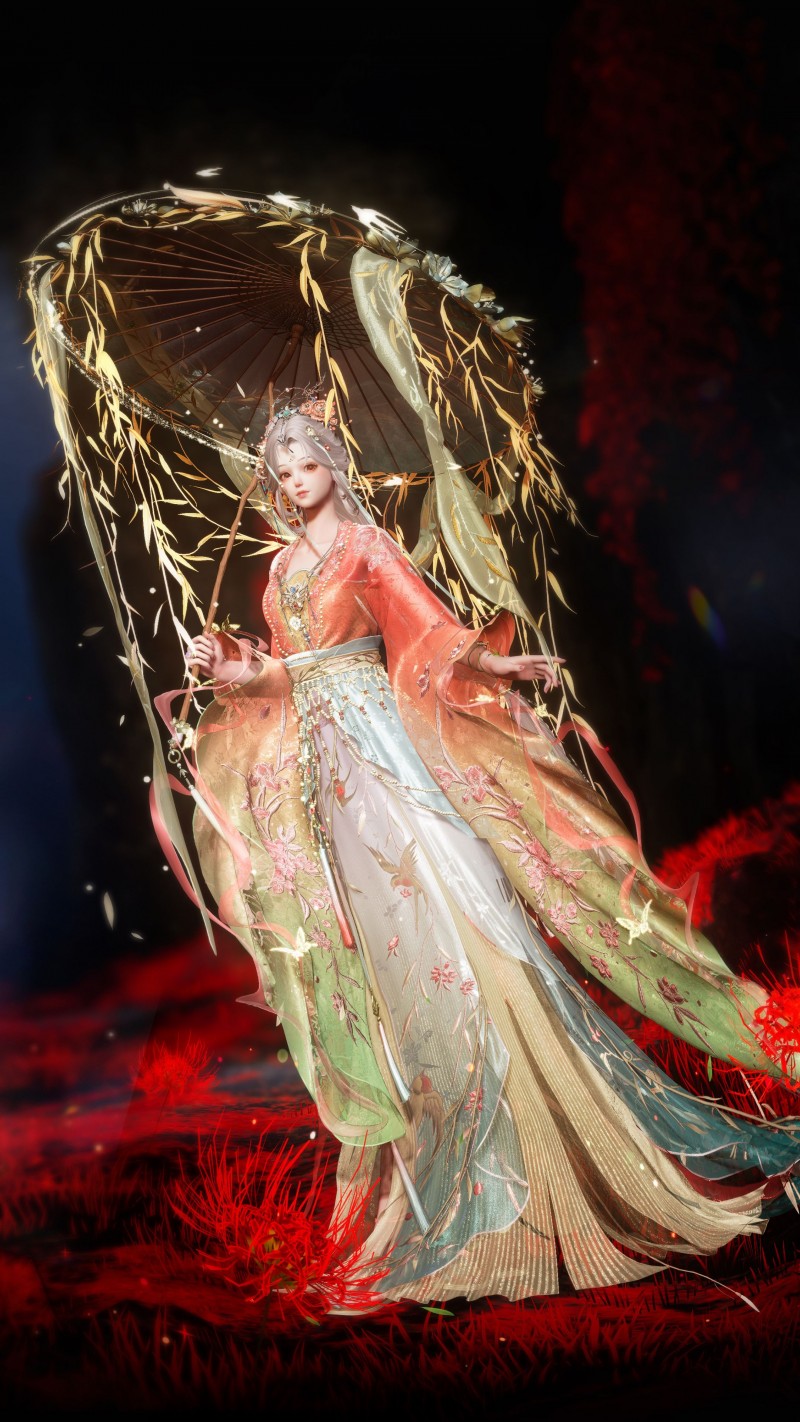 手持的纸伞更是打破传统刚性结构,伞骨幻化为垂坠的柳枝,伞面由鲜嫩的柳叶交织而成,细节细腻逼真,行走间柳叶飘落,自带江南烟雨的浪漫氛围感,仿佛从宋词的婉约意境中走出的仕女,温柔中藏着灵动,简约中透着精致,每一处细节都让人感受到东方美学的独特魅力。版本更新后,只需要参与游戏内活动,就可以获得这套三周年限定六星套装,让每一位玩家都能轻松拥有顶级国风美学体验。