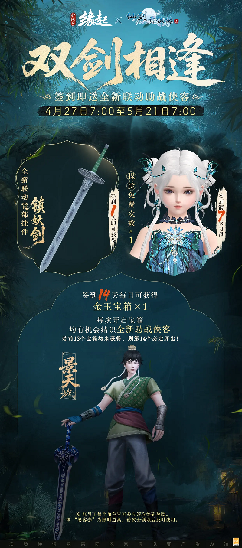 仙剑一梦越千载,侠义同辉入大唐。签到活动上线,海量联动福利免费解锁,仙剑经典角色景天化身助战侠客现身江湖,邀你并肩仗剑。