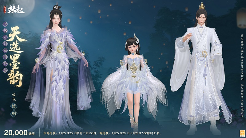 成女款以层叠羽纱裁就衣身,肩袖处羽翼纹理灵动自然,腰侧缀以精致鎏金饰件,仙气盈盈,清雅矜贵。