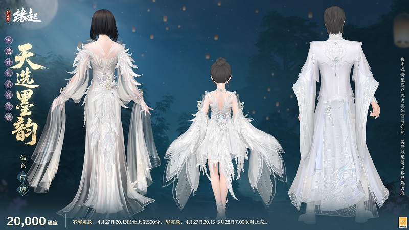 羽纱裁云影,金纹织风华。天选系列外装「天选墨韵」以灵鹤羽翼为设计灵感,将层叠飘逸的轻纱与精致华美的金饰绣纹相融,整体形制灵动雅致。